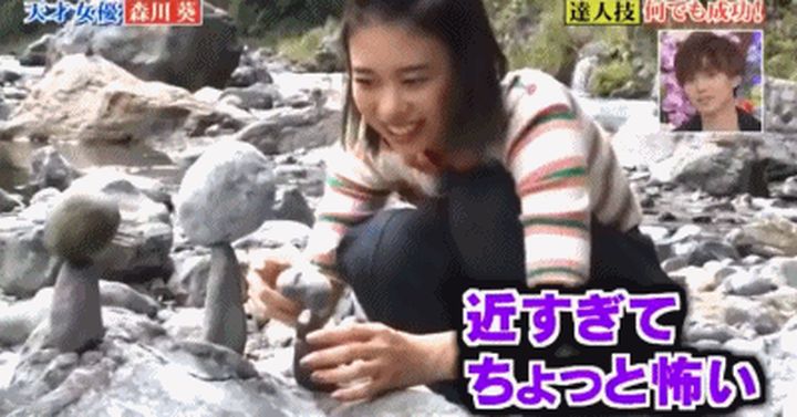 森川葵一遍笑著說(shuō)靠近了感覺(jué)好可怕啊,一邊隨手疊了兩塊石頭。