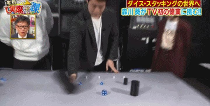 然后骰王演示“鶴舞九天”,就是在橫刀立骰的基礎(chǔ)上,把四個(gè)骰子憑空立在礦泉水的瓶蓋之上。結(jié)果森川葵還是成功了。