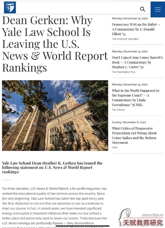 美國當(dāng)?shù)貢r間11月16日,耶魯大學(xué)法學(xué)院突然宣布“他們將退出U.S.News法學(xué)院排名”。沒過多久,哈佛大學(xué)法學(xué)院也緊隨其后,宣布“將不在參加U.S.News對頂級法學(xué)院的年度排名”。